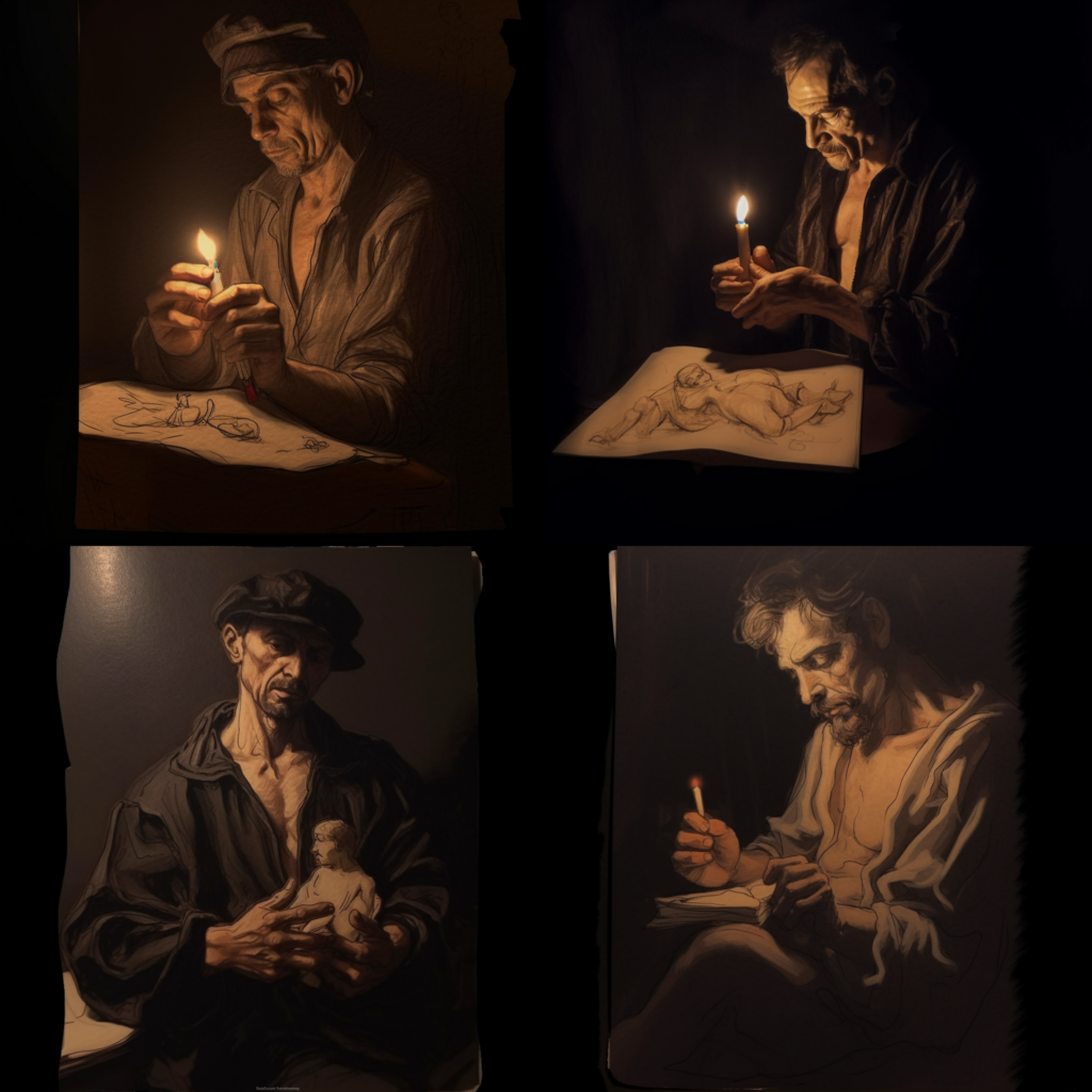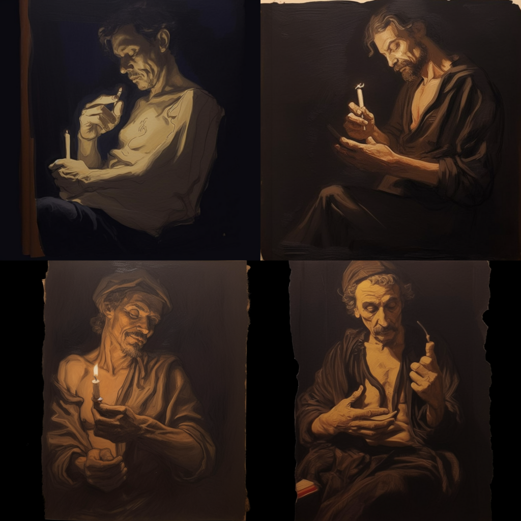 a men in the dark rolling a cigarette lighted by a candle